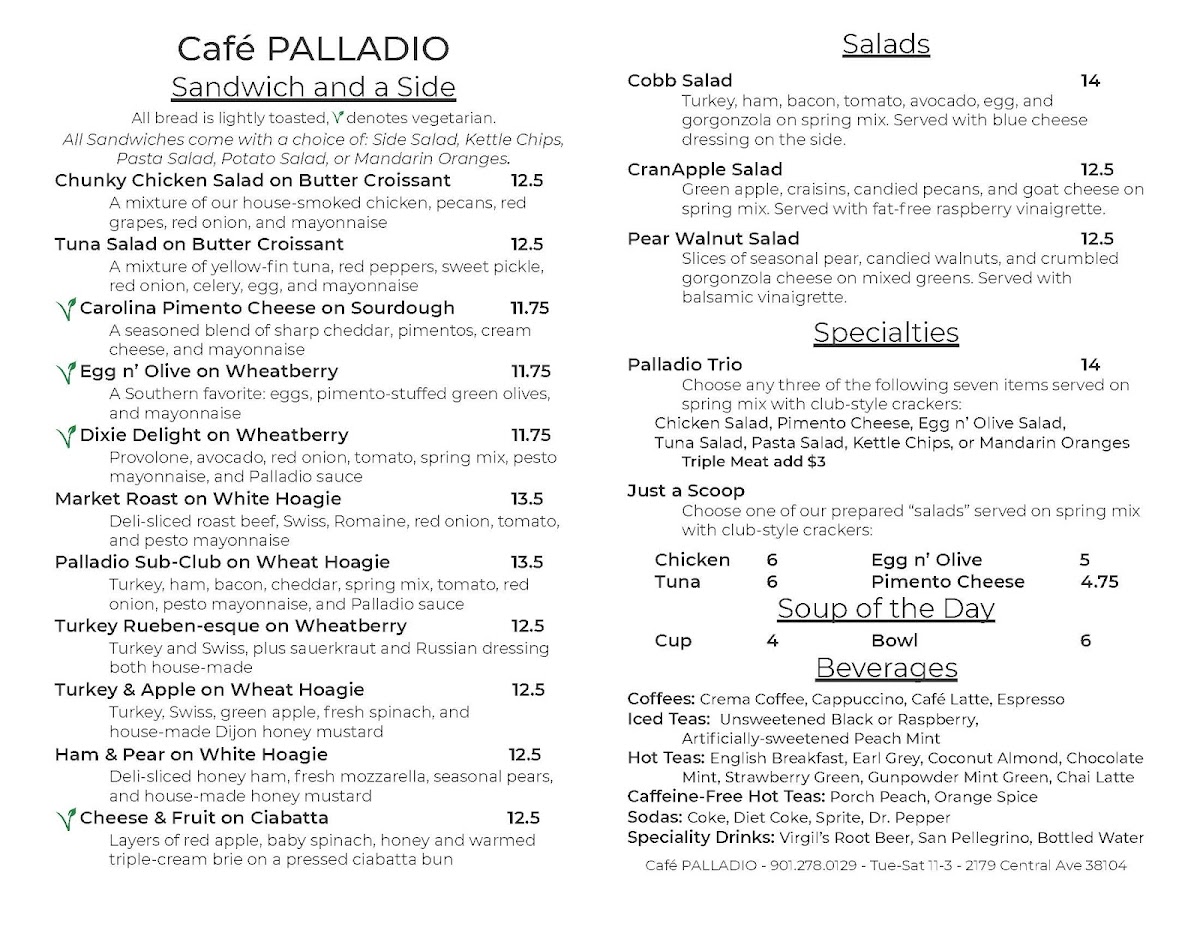 Welcome to Cafe Palladio, a hidden gem located at 2169 Central Ave, Memphis, TN. This charming cafe offers an exquisite menu featuring a delightful array of soups, salads, and specialties, perfect for a casual dining experience.